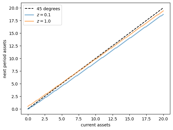 ax.plot(k_vals, k_vals, 'k--', label="45 degrees")