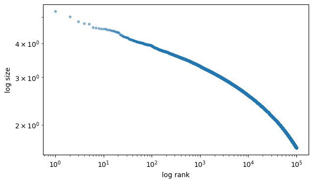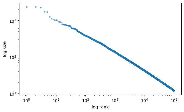 ax.loglog(rank_data, size_data, "o", markersize=3.0, alpha=0.5)