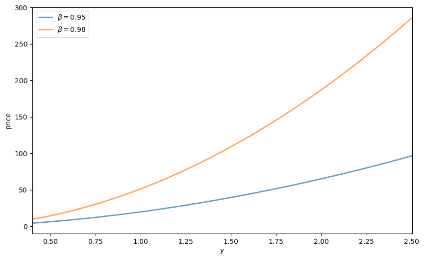 Show this by plotting the price function for the Lucas tree when \(\beta = 0.95\) and \(0.98\).
